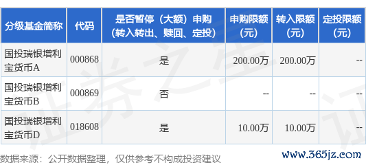 本站消息,6月19日国投瑞银基金管理有限公司发布《国投瑞银增利宝货币市场基金A类基金份额调整大额申购(含转换转入、定期定额投资)业务限制的公告》。公告中提示,为维护现有基金份额持有人利益豪极资本,自2025年6月19日起国投瑞银增利宝货币市场基金A类基金份额调整大额申购(含转换转入、定期定额投资)业务限制,申购、转换转入上限金额为200.0万元,下属分级基金调整明细如下: