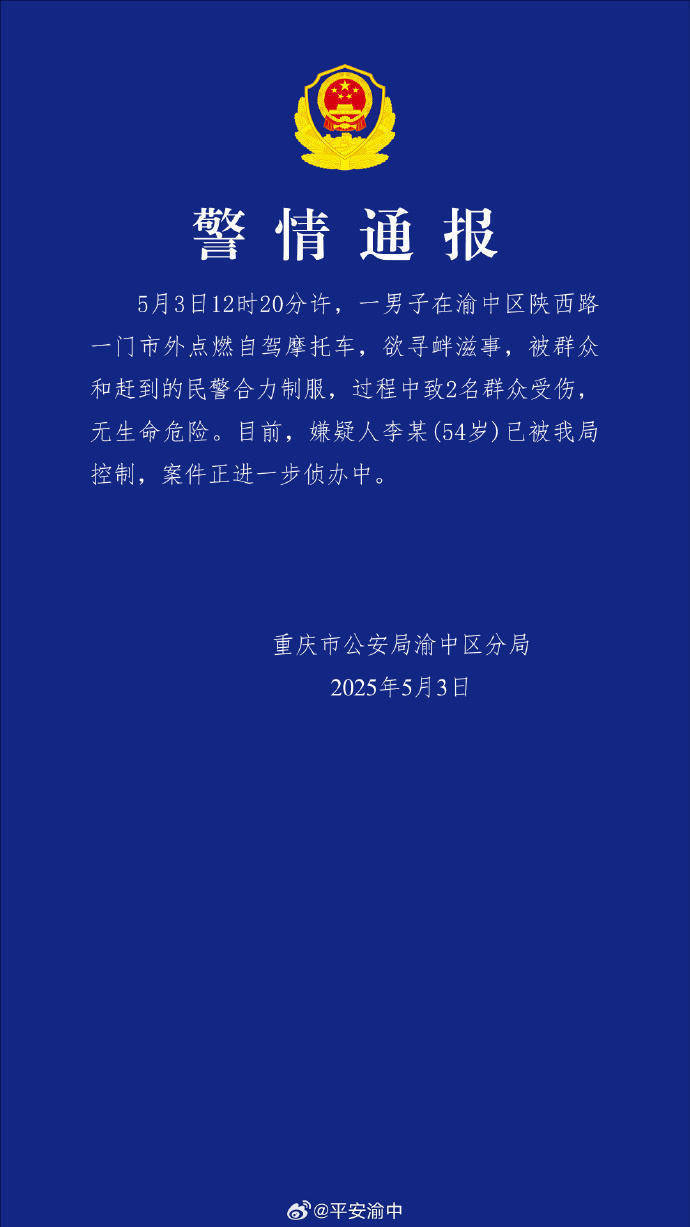 启泰网 一男子点燃自驾摩托车欲寻衅滋事,重庆警方:已被控制,2人受伤