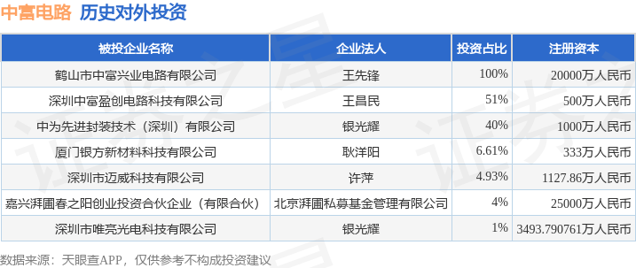 本站消息,根据天眼查APP显示宝货配资,中富电路(300814.SZ)新增一起对外投资事件,被投资公司为嘉兴湃圃春之阳创业投资合伙企业(有限合伙),法定代表人北京湃圃私募基金管理有限公司,投资占比为4%。该公司从事资本市场服务,注册资本为25000万人民币。目前宝货配资,中富电路共存在对外投资7项,详见下表: